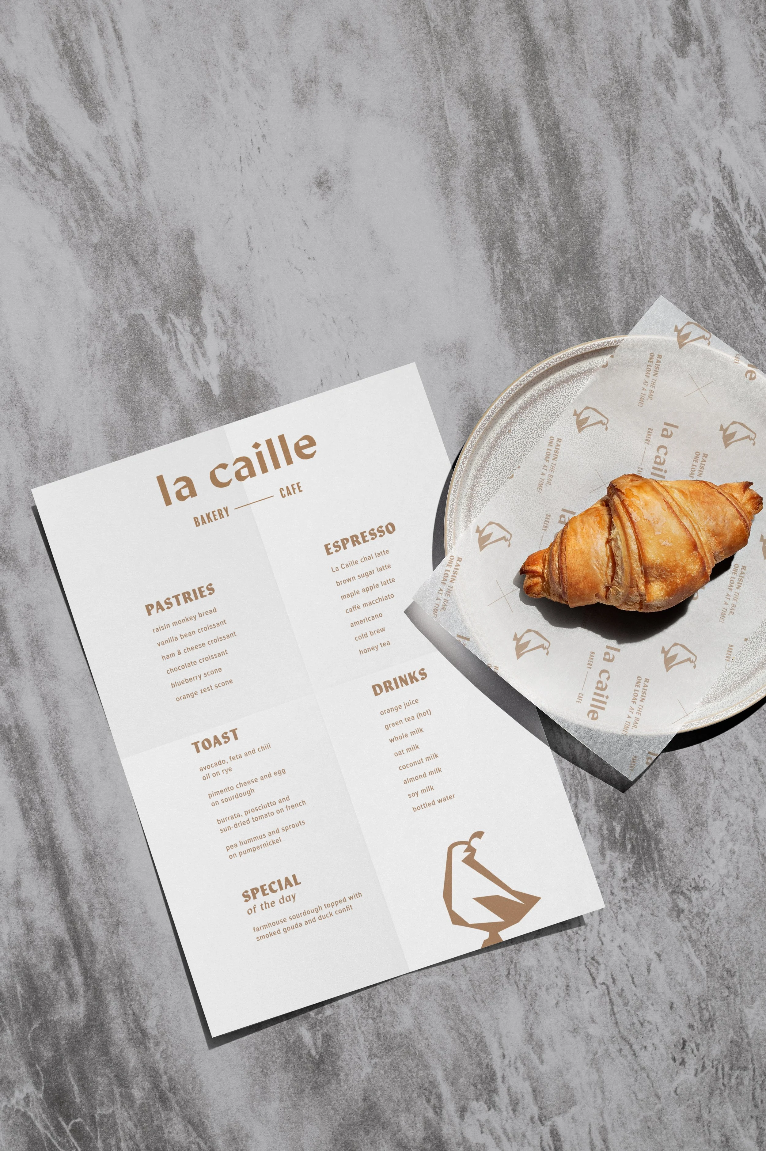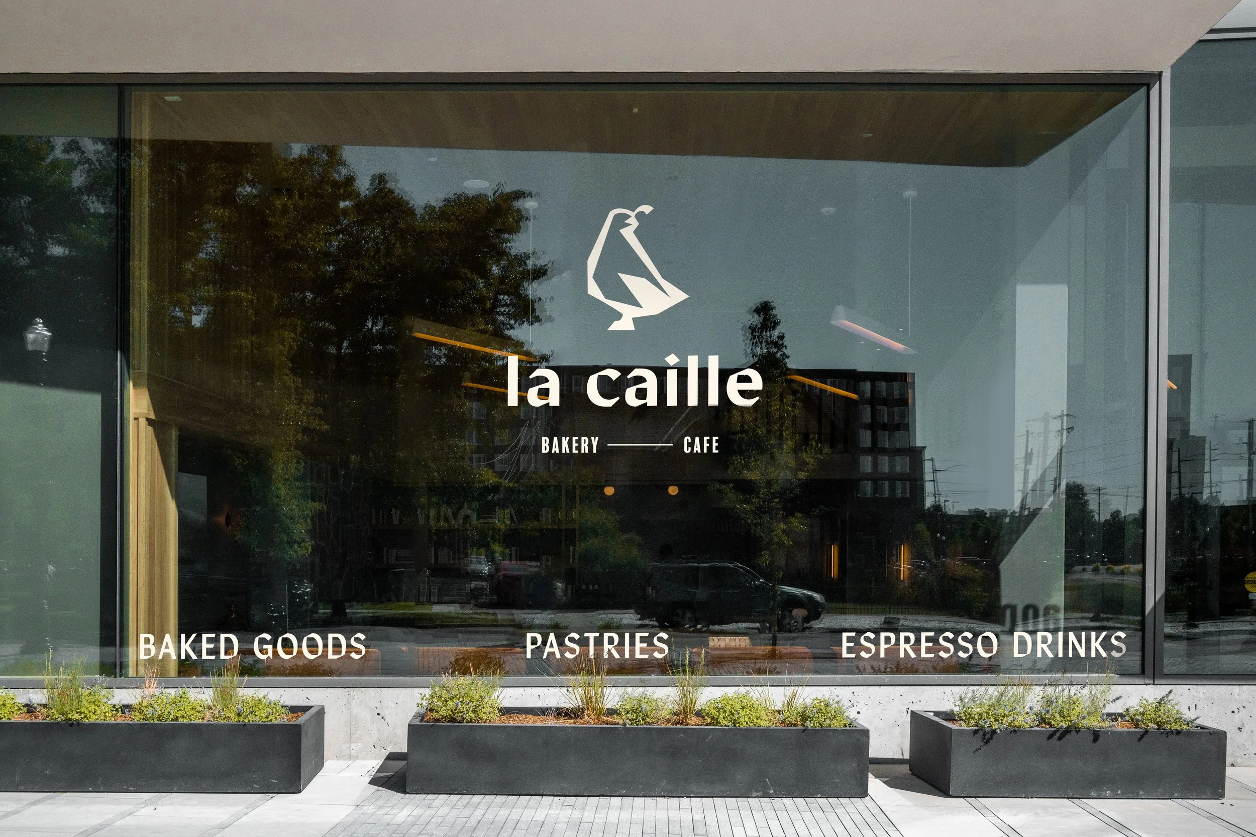 For their branding, we created a logomark that features a dynamic combination of sharp angles and curved lines, recalling Art Nouveau typography frequently seen in and around Paris. We mirrored these same angles and curves in the quail emblem (caille being the French translation of quail).